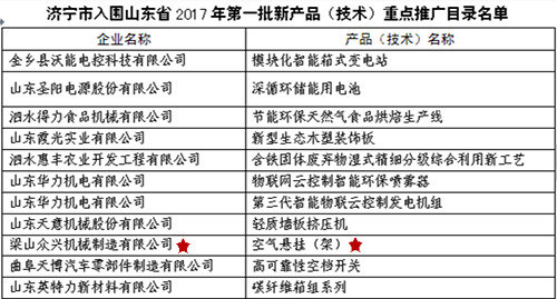 为鼓励和支持企业新产品开发和应用,加快推进新技术产业化,省经信委开展了重点新产品(技术)征集工作。经专家评审和网上公示,133项新产品(技术)列入首批推广目录。 省经信委日前公布《山东省2017年第一批新产品(技术)重点推广目录》,济宁市自主开发的11项新产品入围山东省2017年第一批新产品(技术)重点推广目录,数量居全省前列,入围产品主要集中在节能环保、新材料、高端装备制造等领域。我行业商会理事单位、梁山众兴机械制造有限公司空气悬挂(架)新产品入围省新产品(技术)重点推广目录。 省经信委将在“好品山东”设立新产品(技术)推广专栏,开展线上展示推介,同时选择部分产品(技术)进行现场推广。