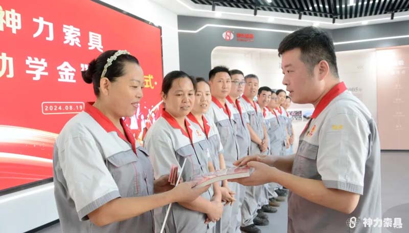 为深入落实企业核心价值观,激励广大学子志存高远、奋力拼搏,8月19日,神力索具在智能制造产业园科技智慧展厅举行职工高考学子升学助学金发放仪式,为今年考取本科的11位应届职工学子发放神力助学基金。 发放现场,董事长兼总经理杜大平首先代表公司恭喜各位升学学子和多年来悉心栽培、无私付出的各位职工家长。他讲到,“神力助学金”设立的初心,既是“以人为本”的企业价值观体现,更旨在通过表彰在学习当中取得优异成绩的职工学子,鼓励新时代年轻人继续努力,勇攀高峰。同时激励更多职工家庭关注子女学业和教育,从而在形成尊重教育、尊重知识、尊重人才的良好氛围,为推动经济社会高质量发展提供有力的人才支撑。